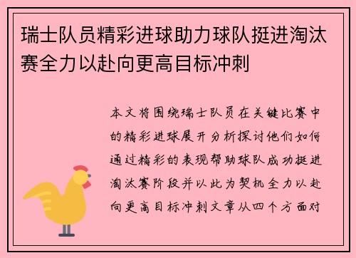 本文将围绕瑞士队员在关键比赛中的精彩进球展开分析,探讨他们如何通过精彩的表现帮助球队成功挺进淘汰赛阶段,并以此为契机全力以赴向更高目标冲刺。文章从四个方面对这一事件进行详细阐述:瑞士队员的个人能力及其精彩进球对球队的贡献;瑞士队整体战术安排和球员间的默契配合;比赛中的关键时刻与心理素质的展现;以及瑞士队在淘汰赛中的战略调整与冲击力提升。每个方面将结合具体赛事细节,进一步揭示瑞士队员如何在困境中展现出强大的斗志与技战术水平,助力球队迈向更高的舞台。最后,本文将对瑞士队员的表现进行总结,展望他们在接下来的比赛中的潜力和目标。